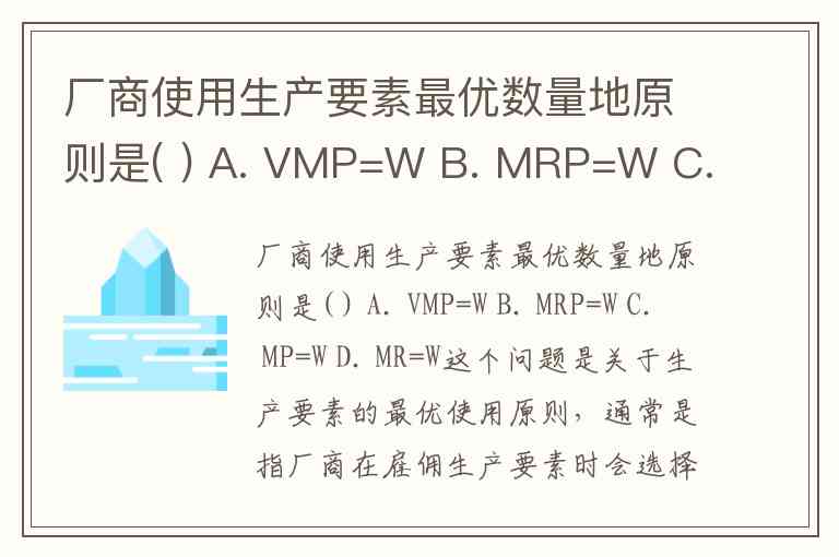 厂商使用生产要素最优数量地原则是( ) A. VMP=W B. MRP=W C. MP=W D. MR=W