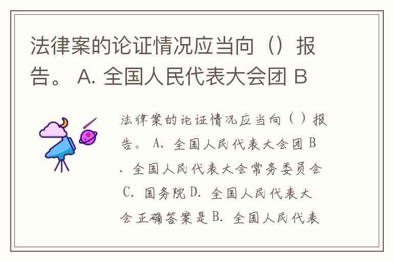 法律案的论证情况应当向()报告。 A. 全国人民代表大会团 B. 全国人民代表大会常务委员会 C. 国务院 D. 全国人民代表大会