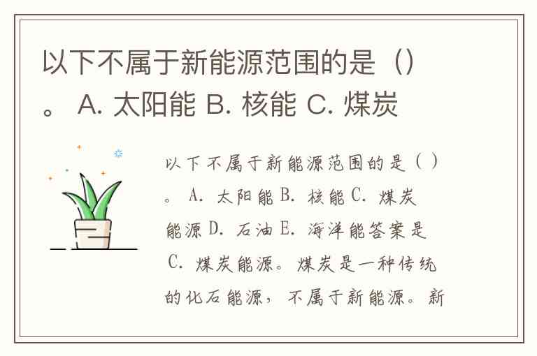 以下不属于新能源范围的是()。 A. 太阳能 B. 核能 C. 煤炭能源 D. 石油 E. 海洋能
