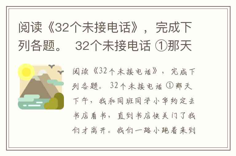 阅读《32个未接电话》,完成下列各题。 32个未接电话 ①那天下午,我和同班同学小华约定去书店看书,直到书店快关门了我们才离开。我们一路小跑着来到公交车站。因为不同路,一会儿,小华坐上了一辆公交车回家去了,而我还在公交站台焦急的等待。还好,没多久,终于来了一辆,我想都没想就跳上车,找了个靠窗的位子坐了下来。 ②这时,天色渐暗,街道两旁亮起了路灯。令人惊喜的是,下雪了!我兴奋地望着窗外。在柔和的灯光下,雪花在空中轻轻飞舞,把整个城市装点得格外宁静、祥和。如果雪一直下到明天,那又会是一番怎样的景色呢?不知过了多久,车到了终点站了,我家离终点站不远。我下了车,可定睛一看,周围怎么这么陌生?糟了,搭错车了!我一下子紧张起来,连忙找手机,想联系妈妈。可是翻遍了书包也没有找到,一定是落在家里了。更令人沮丧的是,我还不记得爸爸妈妈新换的手机号码。四下张望,尽是陌生的面孔。我有些害怕了,这么晚了,我还没到家,爸爸妈妈一定很着急!我自己也急得想哭。我孤零零地站在车站,不知是因为寒冷还是因为害怕,我不停地哆嗦…… ③我是一个性格内向的女孩,不爱说话,是那种看见客人来了就想往房间里躲的孩子。爸爸妈妈很疼爱我,平时也很少让我单独出门。今天因为他们临时有事,而且听说我有同学作陪,所以妈妈提醒我把存有他们号码的手机带上,送我到书店,让我结束后打电话给她,可我…… ④大雪还在下,这时我已丝毫没有了欣赏雪景的心情,只是呆呆地站着。终于,我等来了跑遍周边公交站点来找我的叔叔,叔叔问我怎么在外面呆了这么久,说我妈妈急得都哭了,如果再不回来就要报警了。我告诉他,我搭错了车。晚上8点左右,我终于回到了家。 ⑤一到家,我马上去拿手机,手机是静音状态,手机上的来电显示让我震惊:32个未接电话!20条信息!在我没有回来的这几个小时里,妈妈居然给我打了32个电话,发了20条信息!顿时,强烈的自责让我无地自容。我哭了,我无法想象这几个小时妈妈是怎么度过的!看到一脸疲惫的妈妈,我流着眼泪向妈妈道歉。妈妈慈爱地说:“你长大了,以后出门一定要记得带手机。” ⑥是的,我已经长大了。也许,我要改掉的不是忘带手机的毛病,也不是记不住父母的电话号码,而是要学会应付突发事件。我相信,以后,我一定会变得坚强起来! (1)选文为什么用“32个未接电话”为标题? (2)从记叙的顺序来说,选文的第③段属于什么顺序?主要作用是什么? (3)请对选文的第②段划线句子作一赏析,分析其表达效果。 (4)请根据你对选文的理解和生活体验,说说选文对你的启示(至少说3个方面)。