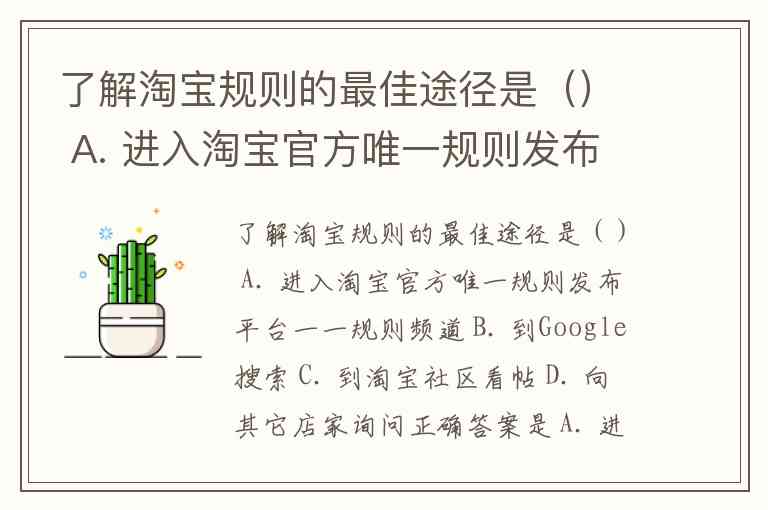 了解淘宝规则的最佳途径是() A. 进入淘宝官方唯一规则发布平台一一规则频道 B. 到Google搜索 C. 到淘宝社区看帖 D. 向其它店家询问