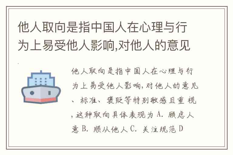他人取向是指中国人在心理与行为上易受他人影响,对他人的意见、标准、褒贬等特别敏感且重 视,这种取向具体表现为 A. 顾虑人意 B. 顺从他人 C. 关注规范 D. 重视名誉