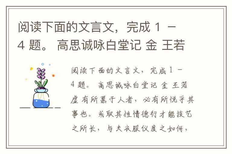 阅读下面的文言文,完成 1 - 4 题。 高思诚咏白堂记 金 王若虚 有所慕于人者,必有所悦乎其事也。或取其性情德行才能技艺之所长,与夫衣服仪度之如何,以想见其仿佛;甚者,至有易名变姓以自比而同之,此其嗜好趋向,自有合焉而不夺也吾友高君思诚,茸其所居之堂以为读书之所,择乐天绝句之诗,列之壁间,而标以“咏白”。 盖将日玩诸其目而讽诵诸其口也。 一日,见告曰:“吾平生深慕乐天之为人,而尤爱其诗,故以是云,何如?” 予曰:“人物如乐天,吾复何议?子能于是而存心,其嗜好趋向,亦岂不佳?然慕之者欲其学之,而学之者欲其似之也。慕焉而不学 学焉而不似 亦何取乎其人耶 ? 盖乐天之为人, 冲和静退,达理而任命,不为荣喜 不为穷忧 所谓无入而不自得者。今子方皇皇干禄之计, 求进甚急,而得丧之念,于胸中,是未可以乐天论也。乐天之诗,坦白平易,直以写自然之趣,合乎天造,厌乎人意,而不为奇诡以骇末俗之耳目。子则雕镌粉饰,未免有侈。而驰骋乎其外,是又未可以乐天论也。虽然,其所慕在此者,其所归必在此。子以少年豪迈,如川之方增,而未有涯涘,则其势固有不得不然者,若其加之岁年而博以学,至于心平气定,尽天下之变,而返乎自得之场,则乐天之妙,庶乎其可同矣。始俟他日复为子一观而评之。” 选自《古文鉴赏词典》 20080506 1 .下列对句子中加点词的解释,不正确的一项是 ( ) A .合乎天造,厌乎人意 厌:厌恶 B .今子方皇皇干禄之计 干:追求 C .自有合焉而不夺也 夺:改变 D .姑俟他日复为子一观而评之 俟:等待 2 .下列句子分别编为四组,都能证明高思诚“未可以乐天论”的观点的一组是 ( ) ①择乐天绝句之诗,列之壁间,而榜以“咏白” ②平生深慕乐天之为人,而尤爱其诗 ③乐天之为人,冲和静退,达理而任命 ④皇皇干禄之计,求进甚急,而得丧之念,于胸中 ⑤雕镌粉饰,未免有侈心而驰骋乎其外 ⑥少年豪迈,如川之方增,而未有涯涘 A .①③④ B .①②⑥ C .③④⑤ D .②⑤⑥ 3 .下列对原文有关内容的理解和分析,正确的一项是 ( ) A .作者认为,一个人如果心中有仰慕的人,就应该首先仰慕他的人格品行,其次是技艺所长,再次是服饰仪度,最后是名姓。 B .作者朋友高思诚,仰慕白居易的为人,尤其爱他的诗,于是修茸了居室作书房,选择了白诗挂在墙上,并题署书房名为“咏白”。 C .作者对高思诚和白居易进行了分析比较,认为高思诚与白居易相差甚远,虽然他很仰慕白居易,但却不适合学习白居易。 D .作者认为高思诚年轻豪迈,如果假以时日,学问广博,也一定可以达到白居易的高妙境界。 4 .把阅读材料中画线的句子翻译成现代汉语。 ( 1 )盖将日玩请其目而讽诵诸其口也 译文: ( 2 )慕焉而不学,学焉而不似,亦何取乎其人耶 译文: ( 3 )不为荣喜,不为穷忧,所谓无人而不自得者 译文: