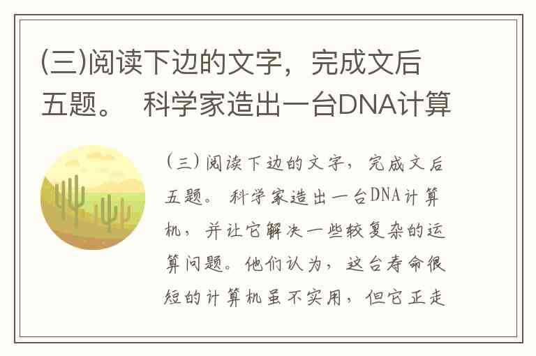 (三)阅读下边的文字,完成文后五题。 科学家造出一台DNA计算机,并让它解决一些较复杂的运算问题。他们认为,这台寿命很短的计算机虽不实用,但它正走出科幻世界,成为一种现实的DNA计算技术。史密斯教授说:“这是一种非自动化的计算机——就像算盘那样,但我们相信它可以像常规计算机一样实现自动化。”常规计算机的技术正在迅速接近微型化的极限,科学家梦想对DNA及RNA的用于保存复杂生物信息的巨大存储能力加以利用。 尽管这一技术研究取得了成功,但在大多数试验中,DNA分子是悬浮在充满液体的试管中的。史密斯小组把DNA分子的活动范围限制在固体表面上。这使技术得到简化,尽管仍无法用它造出可像常规计算机那样解决复杂问题的大型DNA计算机。 经数年研究,史密斯小组造出了几台DNA计算机,每台都由大约100万亿个人工合成的DNA链状结构组成,研究人员对DNA链状结构进行编码,使之针对某个待解决问题能包含所有可能的答案。这些结构能反复解决这个问题,但需要人工帮助把这些DNA链拴到一块盖着薄薄的金片的玻璃上,然后反复地浸入不同的酶溶液中,使酶与DNA发生相互作用,剔除掉不当的答案。每台“计算机”在数天时间里可以进行数项不同的计算。 美国自1994年起就有十来个研究小组从事分子计算研究;杜克大学的教授说:“利用生物技术进行计算的方法有多种,目前还不大清楚那一种方法将脱颖而出。”普林斯顿大学教授的小组致力于开发利用RNA分子的计算潜力,她的小组最近改造了RNA链,使其能处理类似于下国际象棋时遇到的复杂问题,她说,史密斯小组的化学计算机可以解决有16种可能答案的问题,而普林斯顿的RNA计算机可以搜索512种可能的答案。 对“DNA计算机”的理解不正确的一项是: A. DNA计算技术是一种利用生物技术进行计算的方法。 B. DNA计算技术的研究与开发涉及生物学与化学领域。 C. DNA计算技术是根据DNA对生物信息的加工存储原理设计的。 D. DNA计算技术的研究正逐步深入,但目前尚未取得成功。