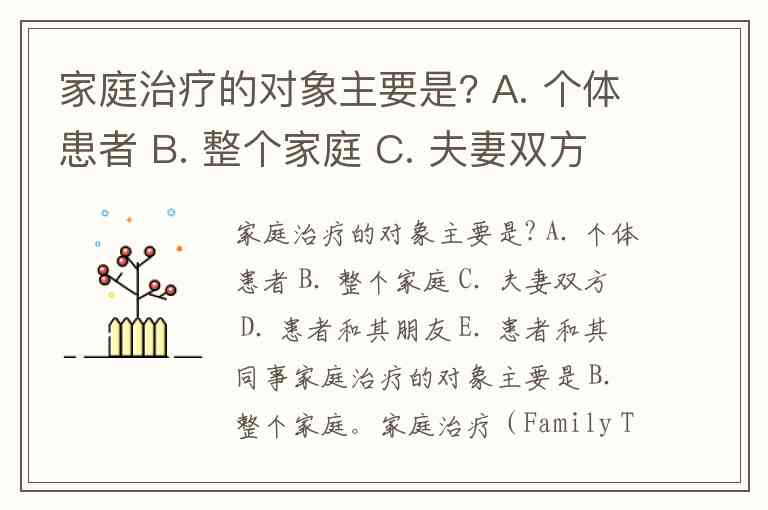 家庭治疗的对象主要是? A. 个体患者 B. 整个家庭 C. 夫妻双方 D. 患者和其朋友 E. 患者和其同事