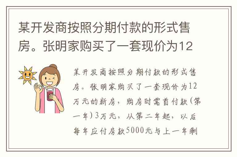 根据题意,张明家购买了价值12万元的房子,首付3万元后,剩余欠款是 12−3=9 万元。从第二年开始,每年应付房款5000元加上上一年剩余欠款的利息。剩余欠款的年利率为0.4%。
