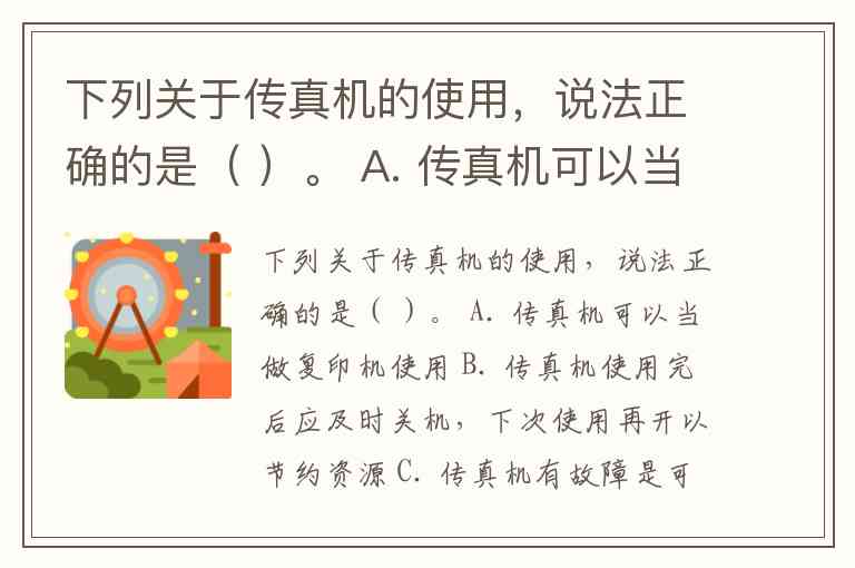 A:传真机和复印机是两种不同的设备,传真机主要用于传输文件,而复印机用于复制文件,因此传真机不能当作复印机使用。