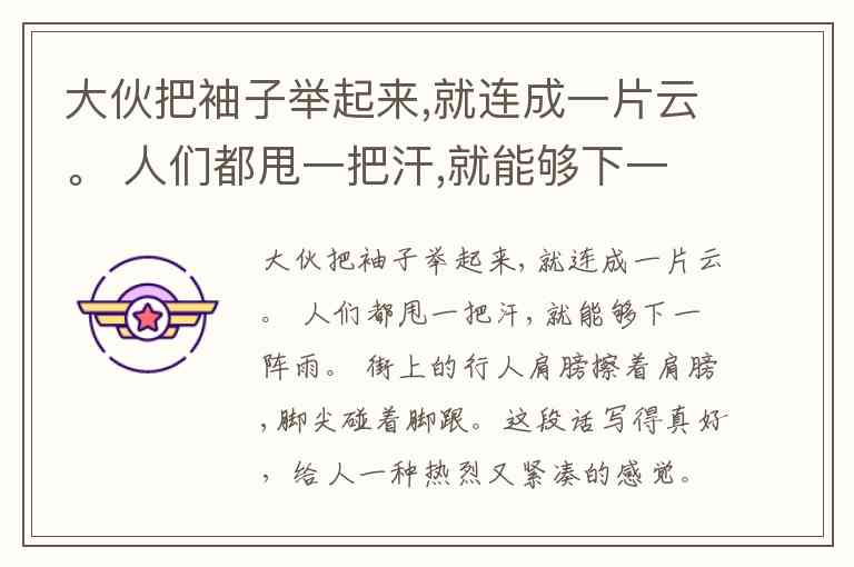 大伙把袖子举起来,就连成一片云。 人们都甩一把汗,就能够下一阵雨。 街上的行人肩膀擦着肩膀,脚尖碰着脚跟。