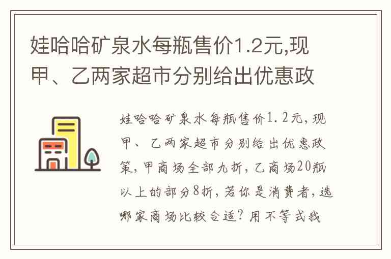 娃哈哈矿泉水每瓶售价1.2元,现甲、乙两家超市分别给出优惠政策,甲商场全部九折,乙商场20瓶以上的部分8折,若你是消费者,选哪家商场比较合适? 用不等式