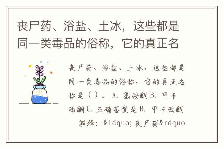 丧尸药、浴盐、土冰,这些都是同一类毒品的俗称,它的真正名称是()。 A. 氯胺酮 B. 甲卡西酮 C.
