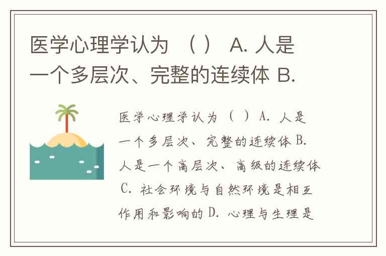 医学心理学认为 ( ) A. 人是一个多层次、完整的连续体 B. 人是一个高层次、高级的连续体 C. 社会环境与自然环境是相互作用和影响的 D. 心理与生理是相互作用和影响的