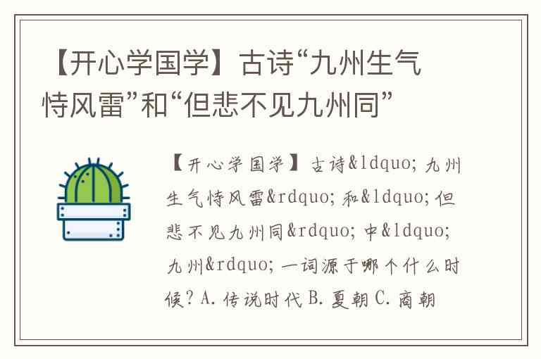【开心学国学】古诗“九州生气恃风雷”和“但悲不见九州同”中“九州”一词源于哪个什么时候? A.传说时代 B.夏朝 C.商朝 D.秦朝