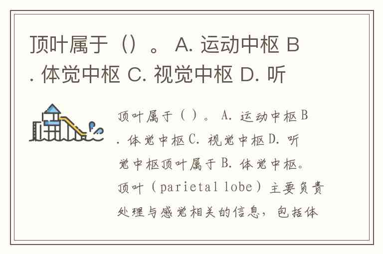 顶叶属于()。 A. 运动中枢 B. 体觉中枢 C. 视觉中枢 D. 听觉中枢