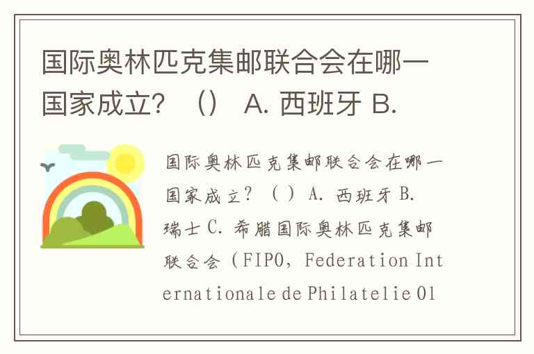国际奥林匹克集邮联合会在哪一国家成立?() A. 西班牙 B. 瑞士 C. 希腊