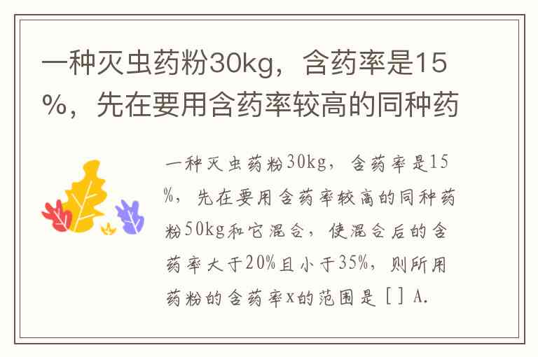 一种灭虫药粉30kg,含药率是15%,先在要用含药率较高的同种药粉50kg和它混合,使混合后的含药率大于20%且小于35%,则所用药粉的含药率x的范围是 [ ] A. 15%<x<23% B. 15%<x<35% C. 23%<x<47% D. 23%<x<50%
