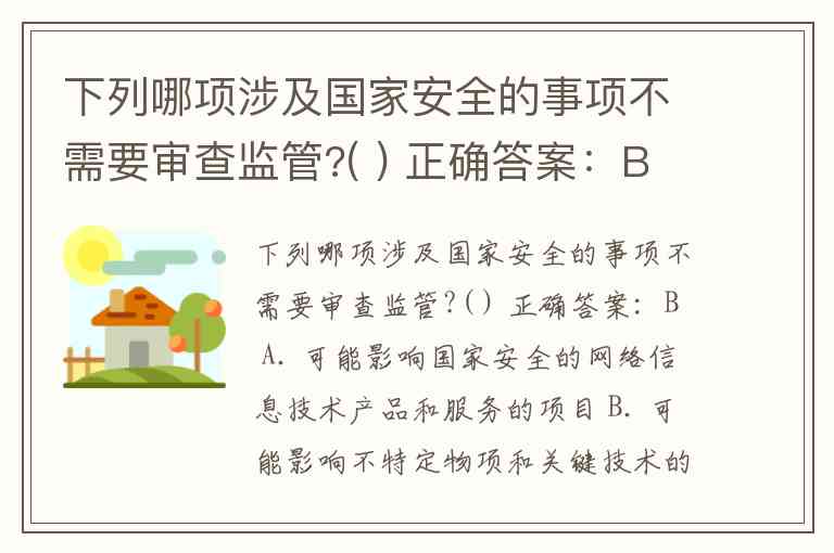 下列哪项涉及国家安全的事项不需要审查监管?( ) 正确答案:B A. 可能影响国家安全的网络信息技术产品和服务的项目 B. 可能影响不特定物项和关键技术的项目 C. 对影响国家安全的特定物项和关键技术的项目 D. 可能影响国家安全的外商投资的项目