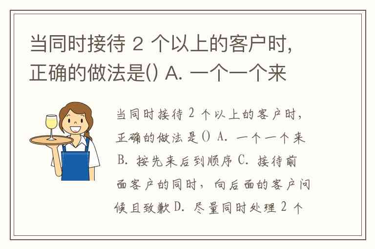 当同时接待 2 个以上的客户时,正确的做法是() A. 一个一个来 B. 按先来后到顺序 C. 接待前面客户的同时,向后面的客户问候且致歉 D. 尽量同时处理 2 个客户的问题