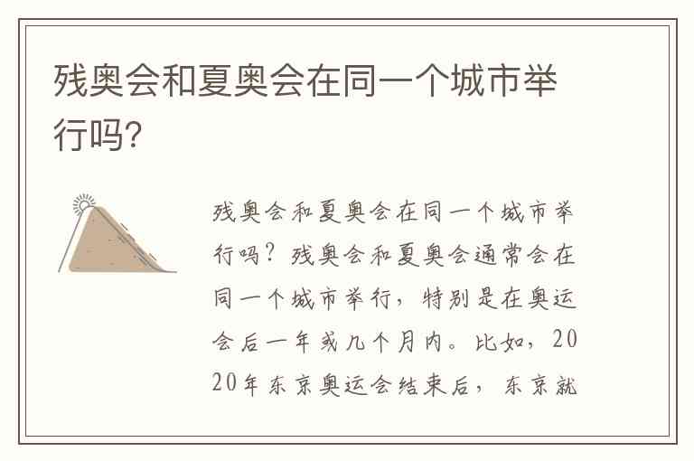 残奥会和夏奥会通常会在同一个城市举行,特别是在奥运会后一年或几个月内。比如,2020年东京奥运会结束后,东京就举行了2020年东京残奥会。残奥会一般紧随夏季奥运会之后,因为它们的基础设施和赛事场地可以共享。奥运会的许多设施都会继续使用,确保残奥会的顺利举办。
