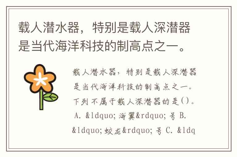 载人潜水器,特别是载人深潜器是当代海洋科技的制高点之一。下列不属于载人深潜器的是( )。 A. “海翼”号 B. “蛟龙”号 C. “深海勇士”号 D. “鹦鹉螺”号