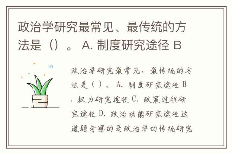 政治学研究最常见、最传统的方法是()。 A. 制度研究途径 B. 权力研究途径 C. 政策过程研究途径 D. 政治功能研究途径