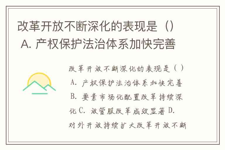 改革开放不断深化的表现是() A. 产权保护法治体系加快完善 B. 要素市场化配置改革持续深化 C. 放管服改革成效显著 D. 对外开放持续扩大