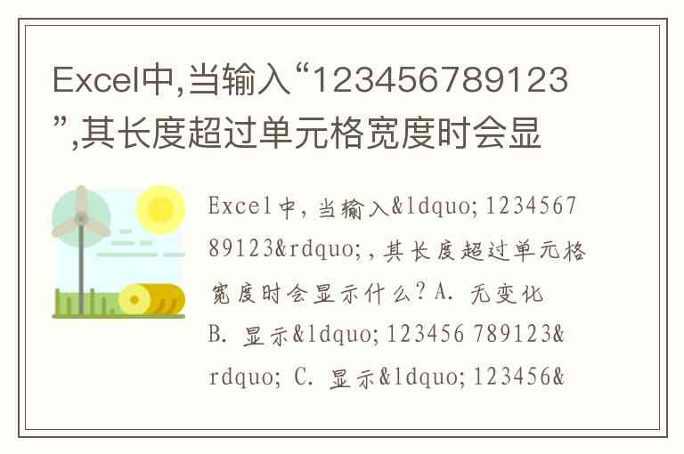 Excel中,当输入“123456789123”,其长度超过单元格宽度时会显示什么? A. 无变化 B. 显示“123456 789123” C. 显示“123456” D. 显示“1.23457E+11”