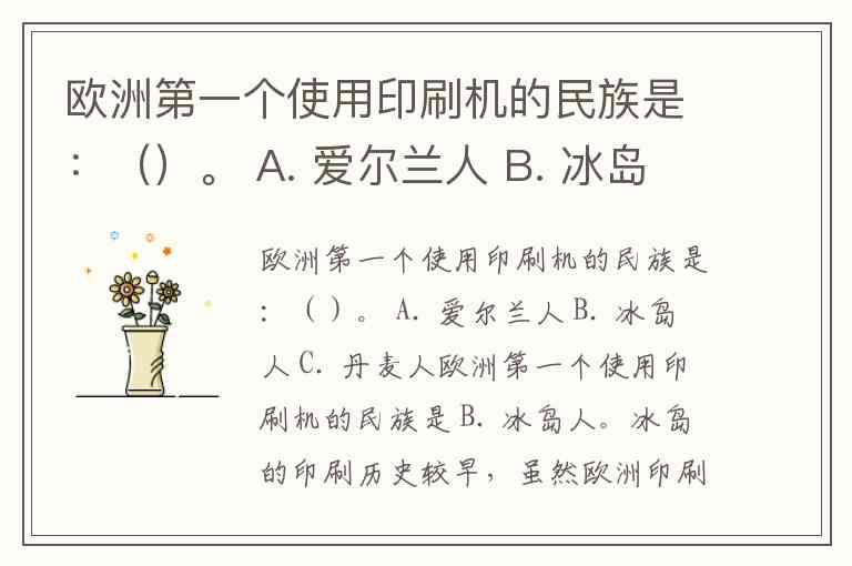 欧洲第一个使用印刷机的民族是:()。 A. 爱尔兰人 B. 冰岛人 C. 丹麦人