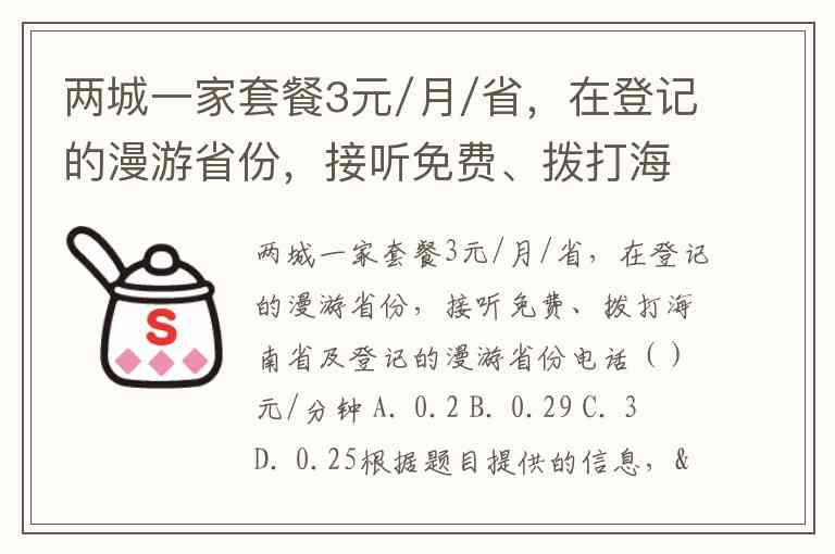 两城一家套餐3元/月/省,在登记的漫游省份,接听免费、拨打海南省及登记的漫游省份电话()元/分钟 A. 0.2 B. 0.29 C. 3 D. 0.25