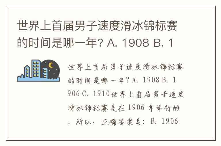 世界上首届男子速度滑冰锦标赛的时间是哪一年? A. 1908 B. 1906 C. 1910