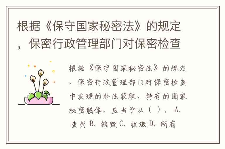 根据《保守国家秘密法》的规定,保密行政管理部门对保密检查中发现的非法获取、持有的国家秘密载体,应当予以( )。 A. 查封 B. 销毁 C. 收缴 D. 所有选项都不正确