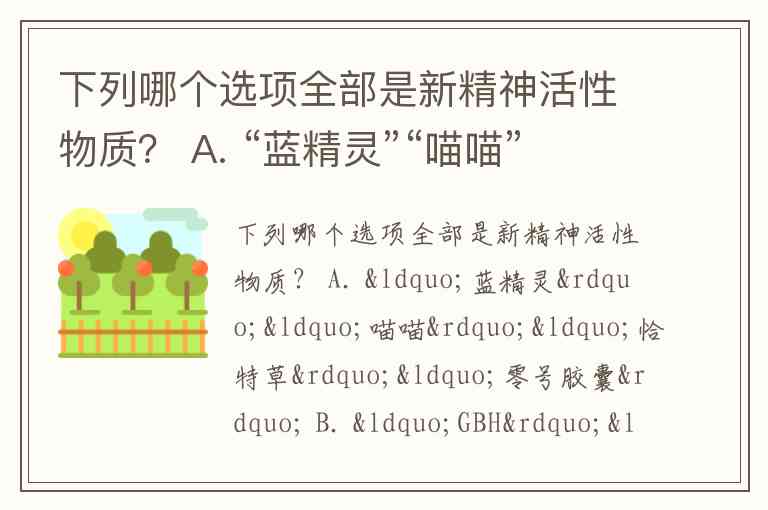 下列哪个选项全部是新精神活性物质? A. “蓝精灵”“喵喵”“恰特草”“零号胶囊” B. “GBH”“彩虹烟”“香蕉水”“笑气” C. “”“”“咔哇潮饮”“” D. “LSD”“止咳水”“浴盐”“吗啡”