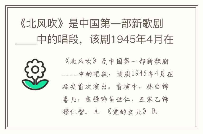 《北风吹》是中国第一部新歌剧____中的唱段,该剧1945年4月在延安首次演出。首演中,林白饰喜儿,陈强饰黄世仁,王家乙饰穆仁智。 A. 《党的女儿》 B. 《白毛女》 C. 《风云儿女》