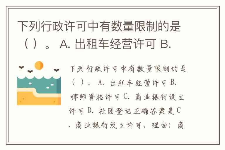 下列行政许可中有数量限制的是( )。 A. 出租车经营许可 B. 律师资格许可 C. 商业银行设立许可 D. 社团登记