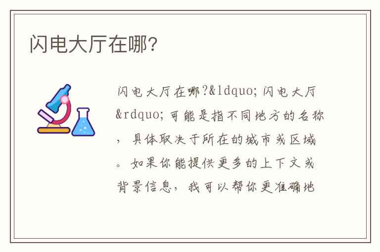 “闪电大厅”可能是指不同地方的名称,具体取决于所在的城市或区域。如果你能提供更多的上下文或背景信息,我可以帮你更准确地找到它的所在地。比如,它是某个游戏中的地点,还是某个餐馆或商场的名称?