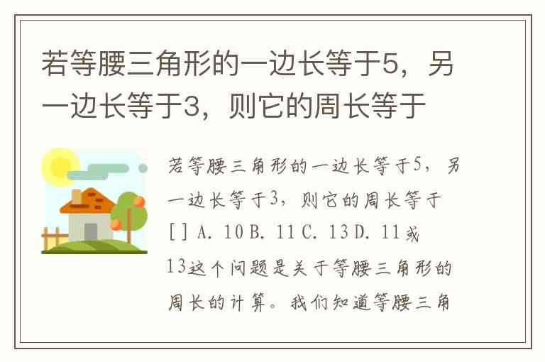 若等腰三角形的一边长等于5,另一边长等于3,则它的周长等于 [ ] A. 10 B. 11 C. 13 D. 11或13