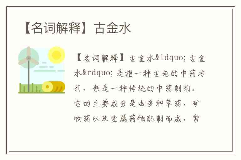 有时候,“古金水”这一名词也会出现在不同的背景下,表示不同的文化或历史遗物。但如果是中医药相关的背景,更多的是指上述的药剂。