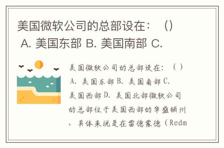 美国微软公司的总部设在:() A. 美国东部 B. 美国南部 C. 美国西部 D. 美国北部