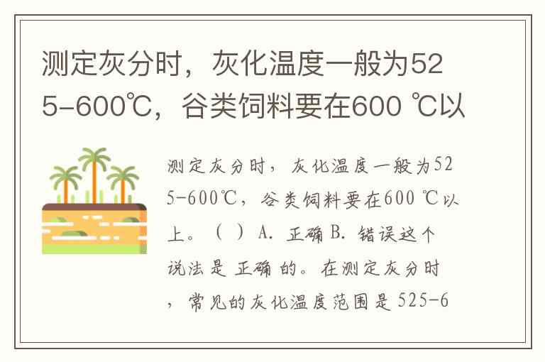 在测定灰分时,常见的灰化温度范围是 525-600℃,而对于谷类饲料,考虑到它们含有较高的有机物质,通常需要提高到 600℃以上,以确保完全灰化。因此,这个说法是正确的。