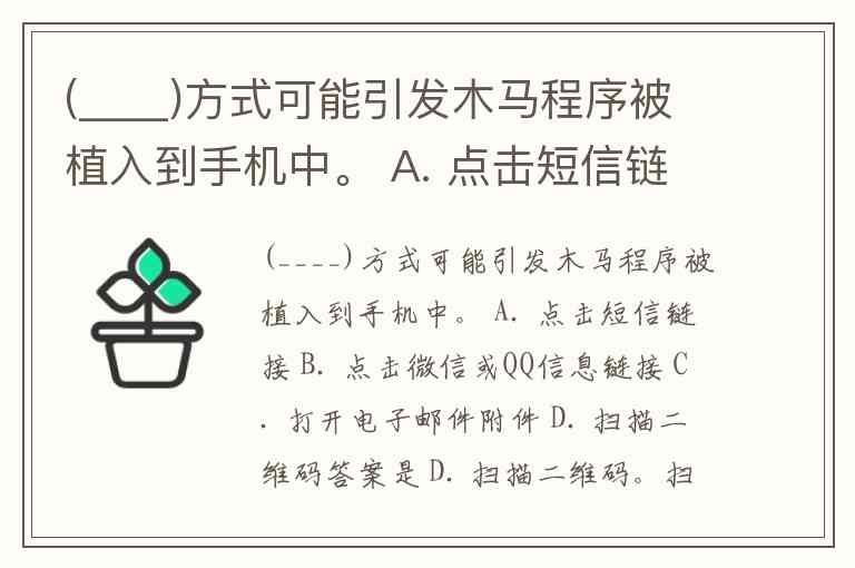(____)方式可能引发木马程序被植入到手机中。 A. 点击短信链接 B. 点击微信或QQ信息链接 C. 打开电子邮件附件 D. 扫描二维码