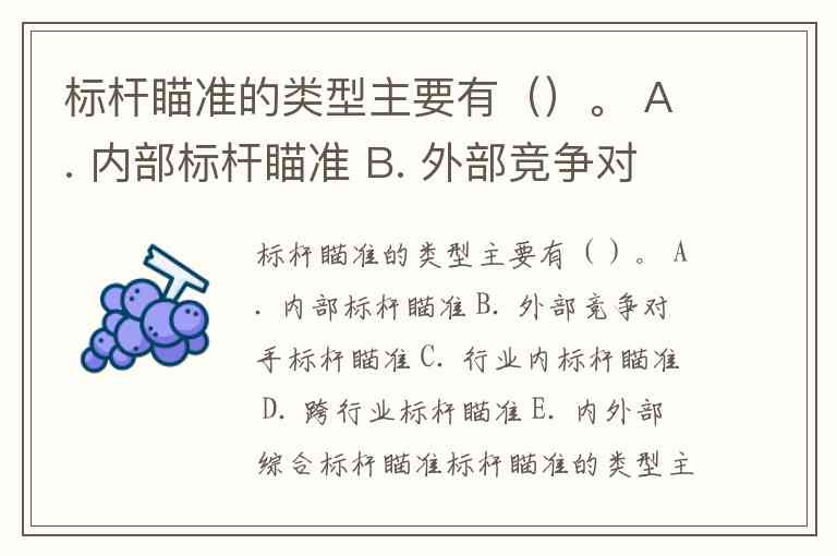 标杆瞄准的类型主要有()。 A. 内部标杆瞄准 B. 外部竞争对手标杆瞄准 C. 行业内标杆瞄准 D. 跨行业标杆瞄准 E. 内外部综合标杆瞄准
