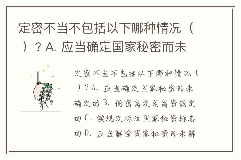 定密不当不包括以下哪种情况( )? A. 应当确定国家秘密而未确定的 B. 低密高定或高密低定的 C. 按规定标注国家秘密标志的 D. 应当解除国家秘密而未解除的