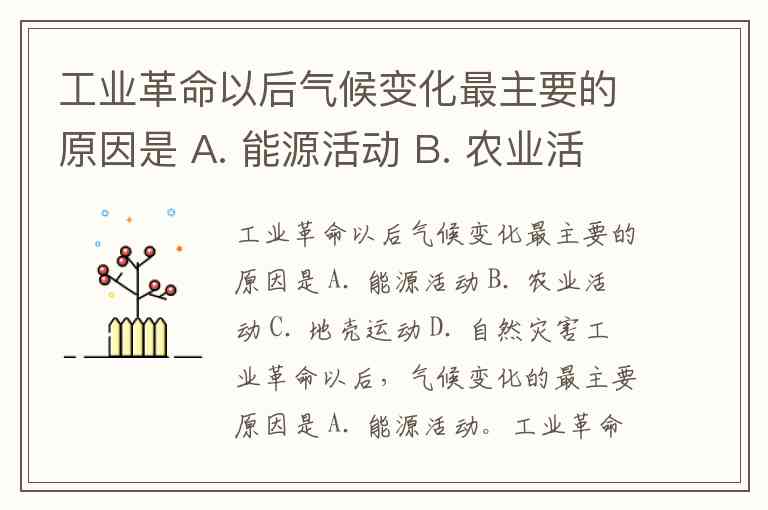 工业革命以后气候变化最主要的原因是 A. 能源活动 B. 农业活动 C. 地壳运动 D. 自然灾害