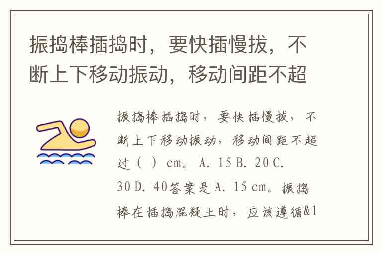 振捣棒插捣时,要快插慢拔,不断上下移动振动,移动间距不超过( ) cm。 A. 15 B. 20 C. 30 D. 40