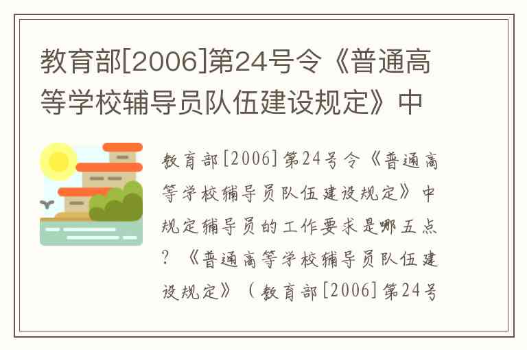 《普通高等学校辅导员队伍建设规定》(教育部[2006]第24号令)中,辅导员的工作要求主要包括以下五个方面: