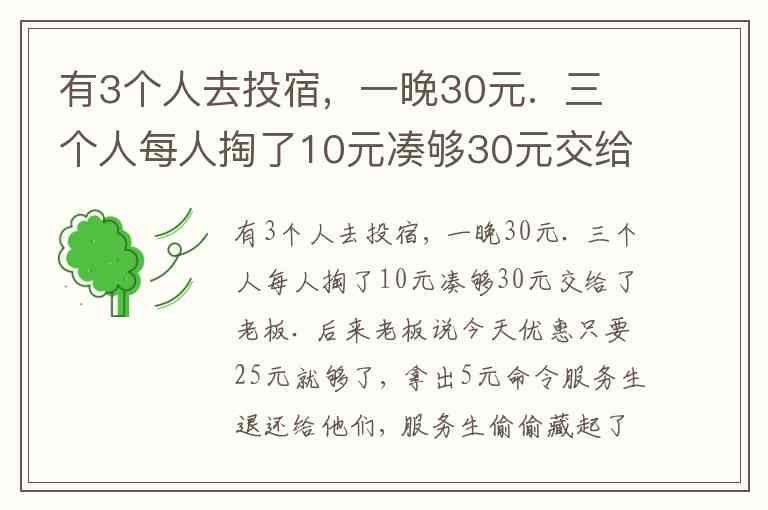 有3个人去投宿, 一晚30元. 三个人每人掏了10元凑够30元交给了老板. 后来老板说今天优惠只要25元就够了, 拿出5元命令服务生退还给他们, 服务生偷偷藏起了2元, 然后, 把剩下的3元钱分给了那三个人, 每人分到1元. 这样, 一开始每人掏了10元, 现在又退回1元, 也就是10-1=9, 每人只花了9元钱, 3个人每人9元, 3 X 9 = 27元 + 服务生藏起的2元=29元, 还有一元钱去了哪里??? 此题在新西兰面试的时候曾引起巨大反响. 有谁知道答案呢?