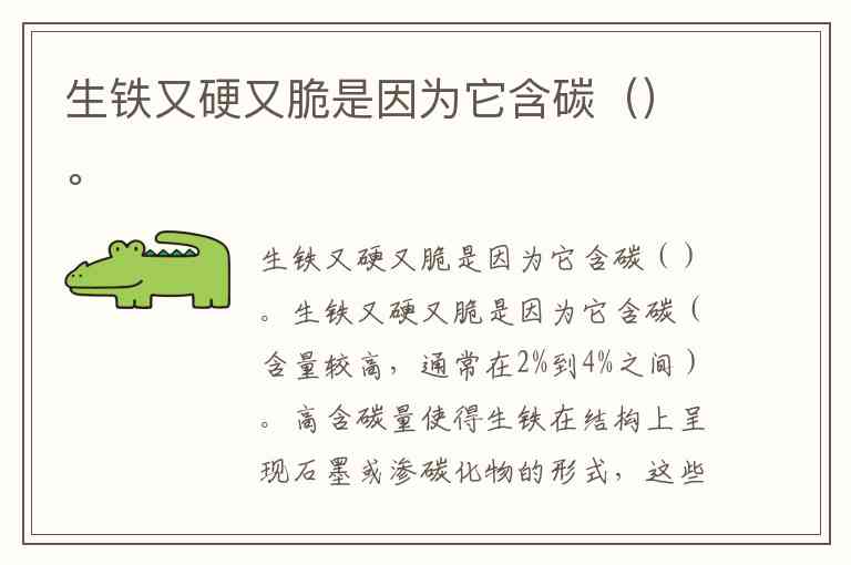 生铁又硬又脆是因为它含碳(含量较高,通常在2%到4%之间)。高含碳量使得生铁在结构上呈现石墨或渗碳化物的形式,这些结构导致它在硬度上很高,但也使它比较脆,缺乏韧性。因此,生铁的硬脆特性与其高碳含量有直接关系。