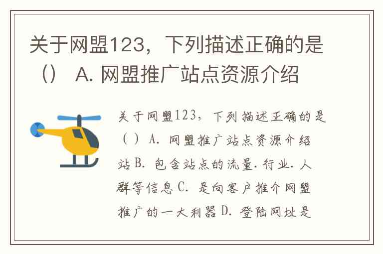 关于网盟123,下列描述正确的是() A. 网盟推广站点资源介绍站 B. 包含站点的流量.行业.人群等信息 C. 是向客户推介网盟推广的一大利器 D. 登陆网址是www.wm123.com