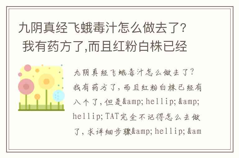 九阴真经飞蛾毒汁怎么做去了? 我有药方了,而且红粉白株已经有八个了,但是……TAT完全不记得怎么去做了,求详细步骤……