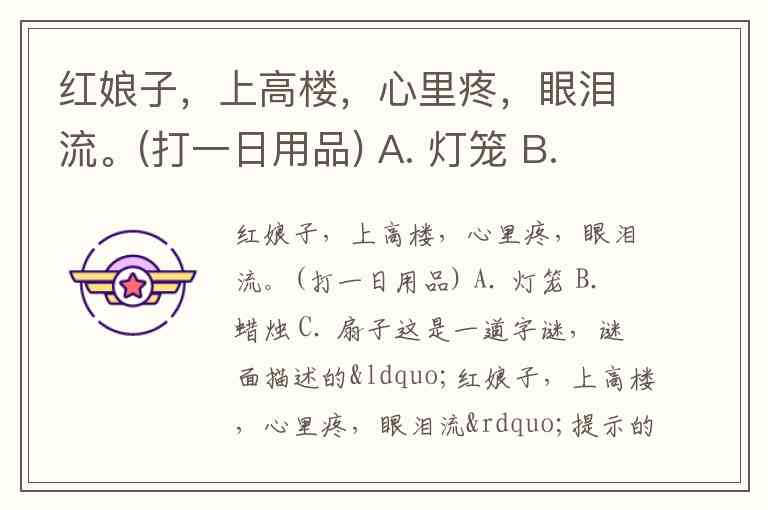 红娘子,上高楼,心里疼,眼泪流。(打一日用品) A. 灯笼 B. 蜡烛 C. 扇子