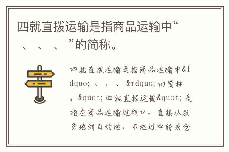 "四就直拨运输"是指在商品运输过程中,直接从发货地到目的地,不经过中转或仓储的运输方式。具体来说,"四就"是对四个环节的简称,通常是: